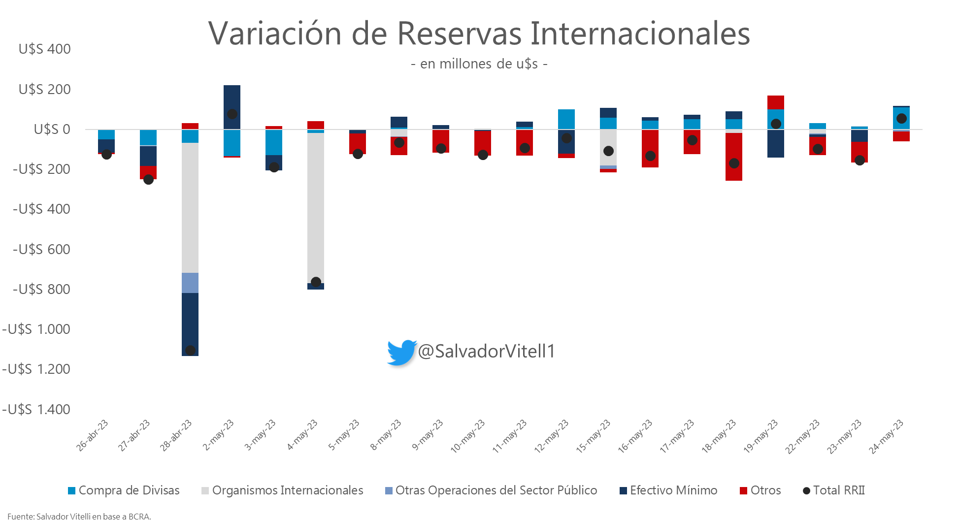 Salvador Vitelli, jefe de Research de Romano Group explicó que está “acá la explicación de porqué el BCRA compraba en Agro/MULC pero perdía reservas”. E indicó que en el rubro “Otros” en la planilla de reservas del Informe Monetario Diario del BCRA se puede estimar que “en su mayoría fue a intervención del dólar financiero” y que se “quemaron” desde el 2 de mayo un promedio de USD 76 millones diarios para frenar a los dólares financieros.