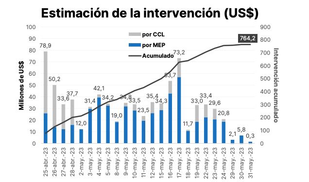 En simultáneo, el BCRA intensificó a partir del 25 de abril la intervención del dólar Bolsa, que se obtiene a través de la compraventa de bonos. La entidad compró títulos públicos a privados, a cambio de dólares de las reservas por casi USD 800 millones, para aplacar las cotizaciones del MEP y del “contado con liqui”, que se arrimaron a los 500 pesos.