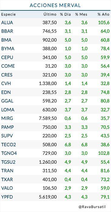 Algunos títulos del panel líder del mercado porteño ya alcanzaron un alza en pesos de 100% desde que empezó el año, como Aluar (+105,6%) y Transportadora Gas del Sur (+102,8%). Otros papeles alcanzaron beneficios en torno al 80%, como es el caso de YPF, Grupo Galicia y Transener.