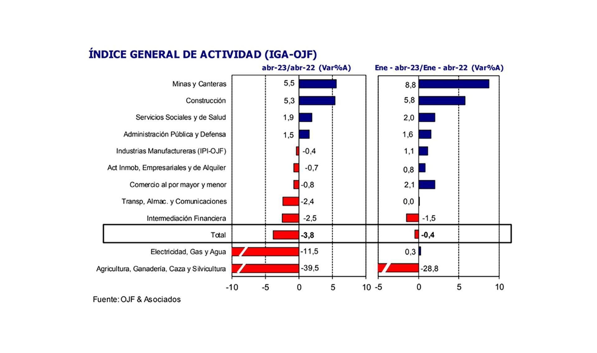 Sin embargo, aclararon que entre los principales sectores también se aprecia el freno de la industria, que mostró en abril una contracción de 0,4%, y la caída del comercio, que sufrió una baja de 0,8% ese mes, según su medición.
