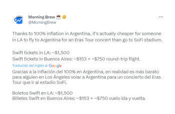 “Gracias a la inflación del 100% en Argentina, en realidad es más barato para alguien en Los Ángeles volar a Argentina para un concierto del Eras Tour que ir al estadio SoFi”, indicó.