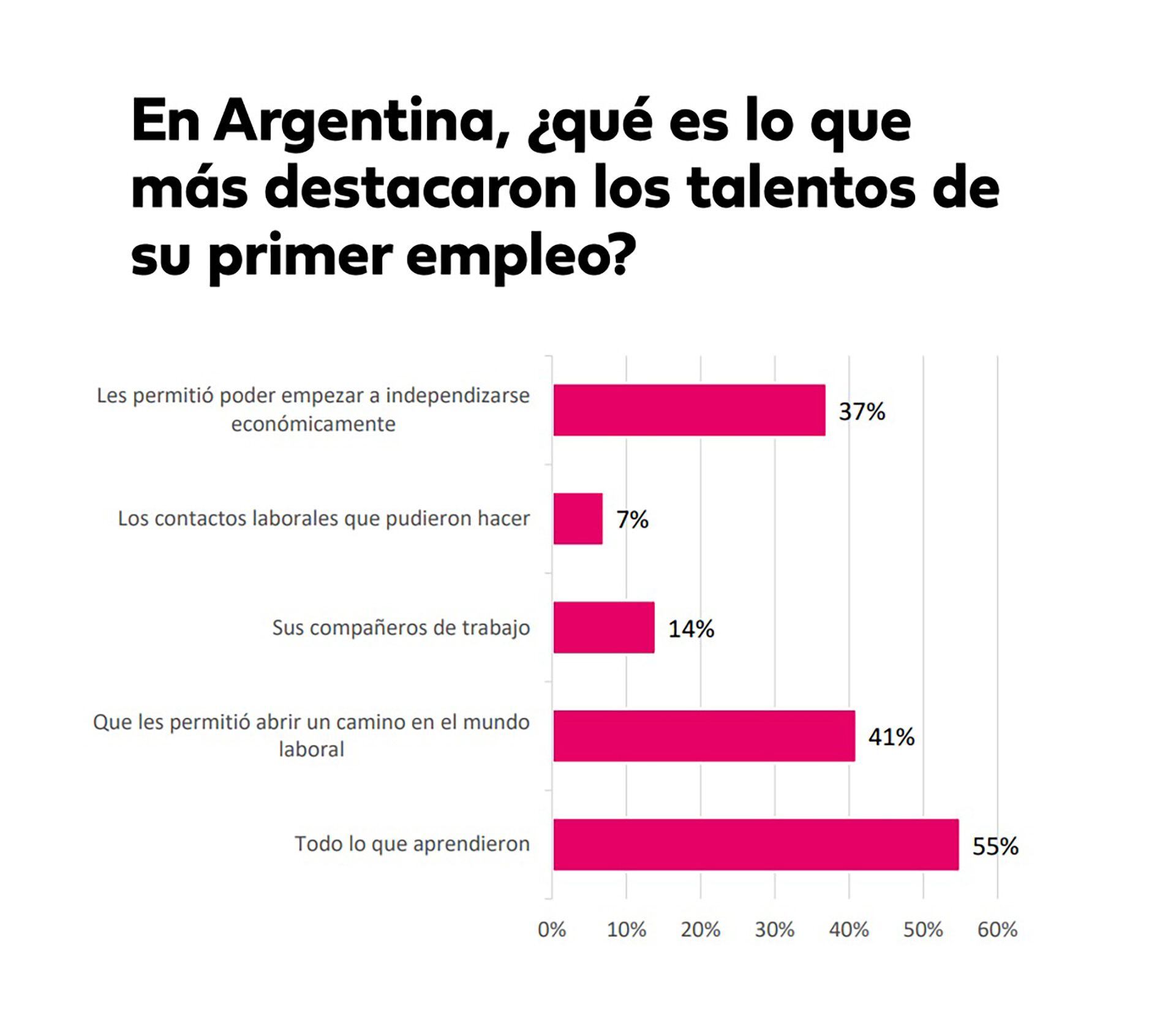 El primer trabajo es fundamental para los argentinos. De hecho, el 54% de los argentinos encuestados señaló que el empleo con el que comenzaron su carrera les enseñó a relacionarse en el mundo laboral y el 20% indicó que “cambió su perspectiva respecto al trabajo”.