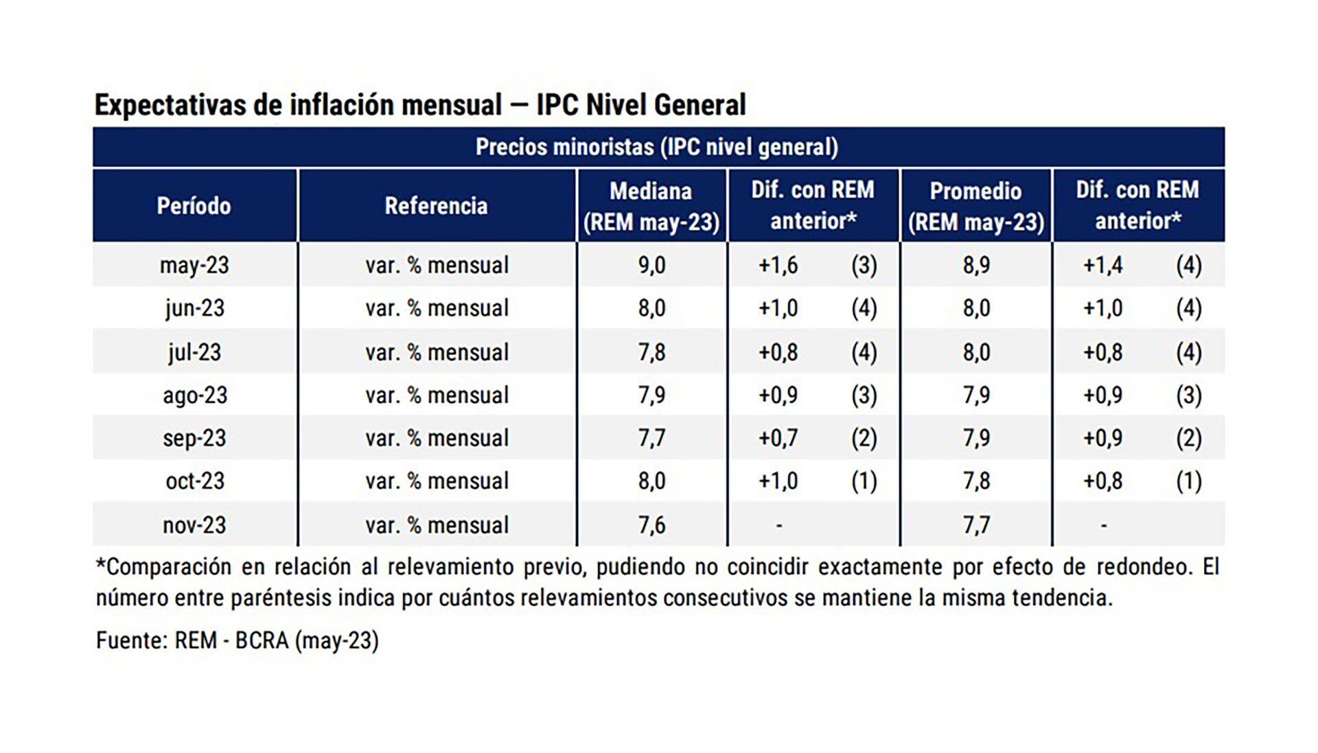 En lo que respecta a los meses posteriores, los especialistas consultados por el BCRA prevén, por el momento, una desaceleración de la inflación mensual, aunque en todos los casos el pronóstico empeoró en relación a lo proyectado en las encuestas anteriores. En junio, por ejemplo, se anticipaba que el IPC avanzaría 7%, pero en esta nuevo edición del REM ya se habla de un 8% para el mes en curso.
