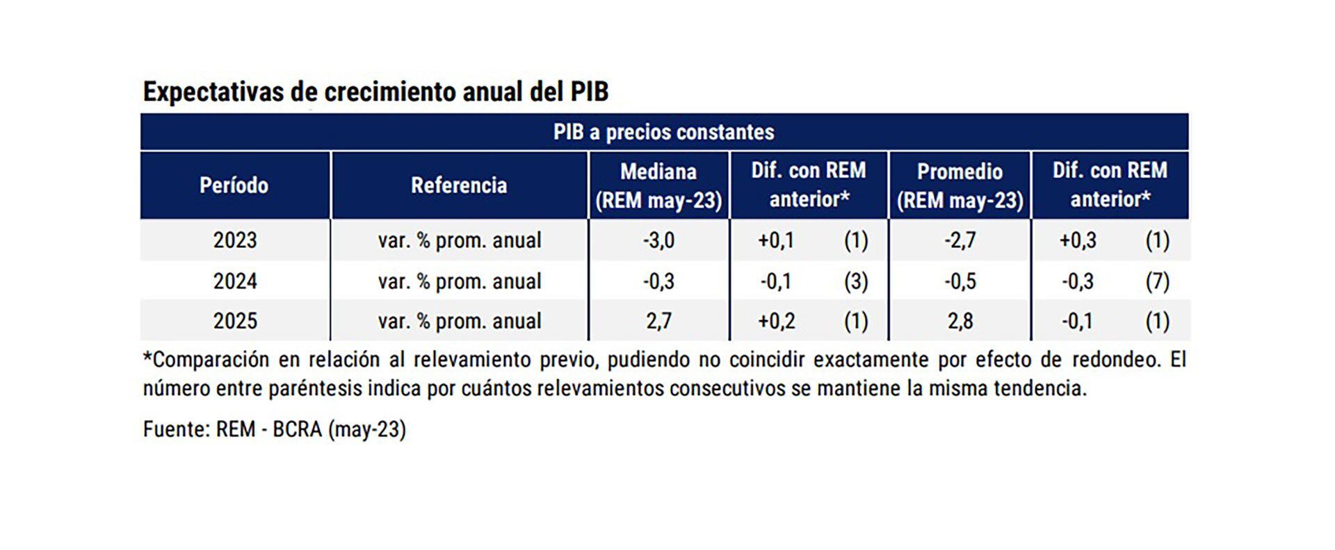 Entre las diferentes variables que se miden en el Relevamiento de Expectativas de Mercado, una de las que menor cambio presentó en el informe de mayo fue el de actividad económica, aunque esa no es necesariamente una buena noticia. Las consultoras, economistas, empresas e instituciones proyectan que el Producto Interno Bruto (PIB) caerá 3% este año. Si bien es una proyección 0,1 puntos porcentuales mejor a la que se arrojó el mes pasado, no deja de ser un dato negativo.