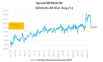 6) Arbitraje entre bonos. En esta línea, el AL30, con ley argentina, viene subiendo más par con ley de Nueva York, el GD30, lo cual se traduce en una notable compresión en el spread por legislación. Desde Portfolio personal explicaron que “el spread GD30/AL30 comprimió a los 16,8% frente a los 19,8% del viernes. Como habíamos resaltado, sin mucha intervención del sector público es esperable que el spread comprima considerando que su promedio histórico se encuentra en torno a al 11%”, una corrección que podría anticipar nuevas subas para los bonos con ley local.