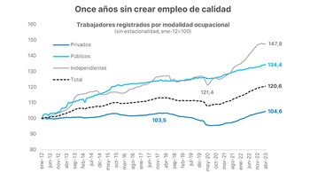 “El empleo ‘de calidad’ (privado) sólo creció 1% desde el pico de abril de 2018 y 4,6% desde enero de 2012, frente a una población que creció 12 por ciento. Esto se da en desmedro de un boom de Independientes desdejunio de 2020 y crecimiento sostenido de públicos desde 2012″, remarcó PPI.