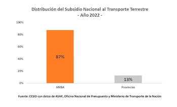 Los subsidios al transporte terrestre de pasajeros se concentraron en el AMBA, donde alcanzaron el 87% del total en el 2022 -la población que vive en ese distrito representa aproximadamente el 30% del total país-. El 13% restante se repartió entre las demás jurisdicciones del país.