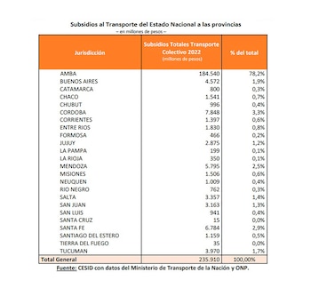 De acuerdo al estudio de Cesid, de los $498.663 millones destinados a subsidios del transporte de pasajeros en 2022 (a nivel nacional), $228.362 se destinaron al financiamiento del transporte ferroviario, $177.263 millones al transporte automotor, $83.388 millones al aerocomercial y $9.650 millones a los otros medios de transporte.