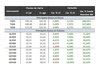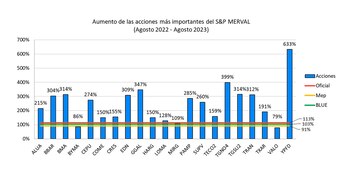 En contraparte, hubo otras acciones, como las de Bolsas Y Mercados Argentinos SA BYMA- (86%) y el Banco de Valores S.A. -VALO- (79%), que tuvieron un incremento por debajo de la inflación y del avance del dólar en sus diferentes cotizaciones entre agosto de 2022 e igual mes de este año.