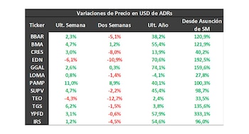 También destacan que los bonos de deuda de Argentina y las acciones locales que cotizan en el exterior (ADRs), exhibieron una importante suba durante la última semana. En lo que respecta a las acciones con cotización en Nueva York, hubo una suba promedio en la última semana de 2,4%. Las de mejor rendimiento fueron las empresas vinculadas al sector energético Pampa Energía -PAM- (+11%) y Transportadora de Gas del Sur -TGS- (+6,2%).