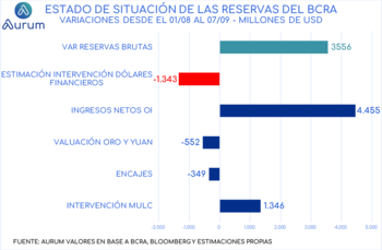 “Estimamos que la intervención en el mercado de dólares financieros -desde comienzos de agosto- le habría costado al BCRA perder prácticamente todos los dólares que logró acumular por el MULC”, señalaron los analistas de Aurum Valores. Según estos cálculos, la intervención en el dólar MEP para mantenerlo debajo de los $700 le habría exigido al Central ventas por unos USD 1.343 millones, prácticamente lo mismo que el saldo comprador que tuvo la entidad en el mercado de cambios por USD 1.346 millones.