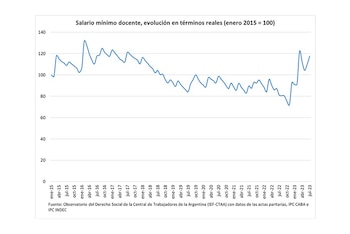 “Nueva revisión de la paritaria nacional docente. Llevan el mínimo a $250.000 en diciembre con lo que el aumento interanual va a ser del 207,4 por ciento”, apuntó el economista de la CTA Autónoma Luis Campos quien destacó que “la recuperación de este año en términos reales fue impactante. Tocó su mínimo histórico en noviembre de 2022 y ya está en niveles similares a los de 2015″.