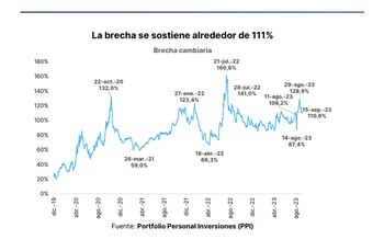 “Esto explicaría la relativa calma del dólar financiero en los últimos días. Al respecto, el CCL Senebi finalizó el viernes en $737, cayendo 0,7% respecto a los $742 de la semana previa. Así las cosas, la brecha cedió a 110,6% desde 112%, aunque, tomando mayor perspectiva, desde casi 130% el 29 de agosto. De esta manera, el spread lleva cuatro ruedas oscilando cerca de 111 por ciento”, destacaron desde PPI Inversiones.