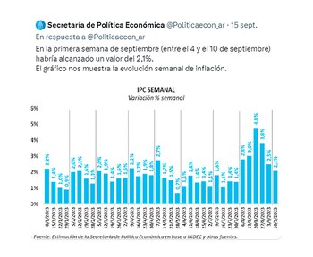 En ese contexto, Economía decidió empezar a informar las mediciones de inflación semanal de la secretaría de Programación Económica, que encabeza Gabriel Rubinstein, el macroeconomista del equipo económico, para señalar que, pese a ser muy alta, la inflación empezó a descender, como muestra el gráfico de abajo.