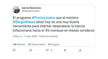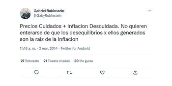 Massa apuesta a mantener controlada la inflación con los acuerdos de precios y la postergación de aumentos clave, como combustibles, tarifas, prepagas. pero el Rubinstein tiene un historial de desencuentro con el método. En marzo de 2014 2014 señalaba que de nada servía el programa “Precios Cuidados” si había “Inflación Descuidada”, porque a su juicio el gobierno de Cristina Fernández de Kirchner no quería “enterarse de que los desequilibrios por ellos generados son la raíz de la inflación” (ver arriba).