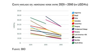Colombia publicó su estrategia (que promueve los “colores” azul y verde) en octubre de 2021, con la meta de producir hacia 2030 en el Caribe Norte “donde se concentran los mejores recursos renovables, hidrógeno verde a un valor de 1,7 dólares por kilo, mientras que el azul, se produzca un costo de 2,4 dólares por kilo”. Hacia 2050, precisó Romano, Colombia produciría hidrógeno verde y azul a cerca de 1 dólar el kilo, un precio altamente competitivo.