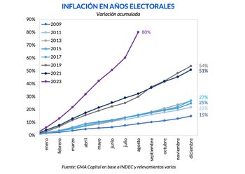 3) Efecto arrastre post devaluación. El “pass through” o traslado a precios de la devaluación de agosto fue inmediato y deja un arrastre para septiembre y octubre, con proyecciones de inflación en los dos dígitos mensuales, y próximas al 160% para el acumulado de doce meses de 2023.