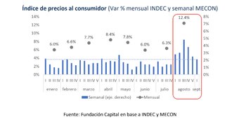 Un informe de la Fundación Capital coordinado por el economista Carlos Pérez detalló que “la publicación con periodicidad semanal del índice de precios refleja la realidad de una inflación que tiende a duplicarse año a año, desde 2022 y también en 2023. En efecto, tras el máximo de agosto (12,4% mensual), y más allá de la desaceleración semanal, con un arrastre estadístico de 6,8 puntos, el noveno mes no quebrará la barrera de los dos dígitos mensuales (10,8% estimado). Así, casi la totalidad de la competitividad ganada tras el salto cambiario del 14 de agosto se habría consumido en dos meses, dejando a la economía con una nominalidad superior y sin corregir ningún precio relativo”.