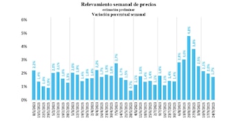 A la vez, la cartera que conduce el economista Gabriel Rubinstein compartió un gráfico donde se ve la evolución de precios y cómo estas últimas cinco semanas fueron registrando una tendencia a la baja. Cabe señalar que, hasta ahora, la semana con menor inflación de 2023 fue a finales de mayo, cuando la suba de precios fue del 0,7 por ciento.
