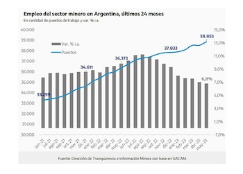 A mayo de 2023 -último mes para el que se cuenta con datos- el empleo minero en Argentina alcanzó a 38.853 puestos de trabajo, un aumento del 6,8% en relación a mayo de 2022, precisa un informe de la Secretaría de Minería.