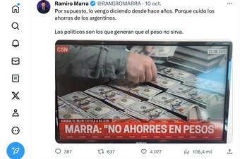 Este martes, en medio de la corrida cambiaria por la escalada del dólar blue, fue Ramiro Marra quien lanzó una serie de tuits en los que aludía a la depreciación de la moneda: “Hoy más que nunca no ahorres en pesos. Cuidá tu dinero, te costó mucho ganarlo”.