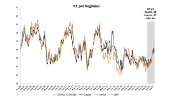 Por región y comparando con el mes anterior, sobresale la suba de la Confianza del Consumidor en el Interior, 4,99%, seguida de GBA con 3,74%; y en menor medida en CABA 2,93%, pese a que en ese ámbito venía de una disminución de 7,1% en septiembre, en contraste con el resto del país, donde se había detectado un comportamiento mixto: caída de 2% en el agregado de las provincias excluidas la Ciudad y Provincia de Buenos Aires, donde había mejorado 0,4 por ciento.