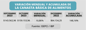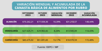 De acuerdo con el Índice Barrial de Precios, la canasta básica total para una familia tipo alcanzó un valor de $343.772 en contraste con los $320.145 del mes anterior. La canasta de alimentos, en tanto, se divide en tres grandes rubros que tuvieron variaciones del 10,3% en productos de almacén, de 8,2% en los productos de verdulería y de 13,2% en la carnicería . Ese último rubro es el que mayor inflación acumulada registra, con una suba de 172,5% en los primeros 10 meses del año.