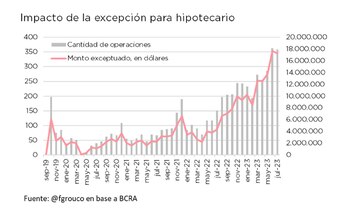 “Pero desde mediados de 2022 esto cambió y esta excepción empezó a explicar el 65% del total financiado con hipoteca a personas físicas. Y hubo picos de algunos meses con 74%. Tres mil de las 5.700 se dieron entre agosto de 2022 y julio de 2023″, agregó.