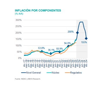 Según el BBVA, la corrección de tipo de cambio y de las tarifas de transporte y energía, impulsará una fuerte aceleración inflacionaria en los primeros meses de 2024 hasta alcanzar un máximo entre abril y mayo. “Luego, de la mano de un plan de estabilización, esperamos que la inflación comience un sendero mensual descendente para terminar acumulando en el año un 155%” para fin del próximo año. Es que, según entienden en el banco, la reducción de la inflación es la principal demanda del electorado por lo cual lo que proyecta el informe es que “el escenario más probable es el establecimiento de algún tipo de ancla cambiaria, en un escenario sin asistencia monetaria al fisco, para reducir la inflación de forma rápida y poder así mostrar los resultados que el electorado demanda”.