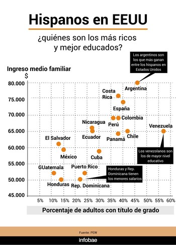 Con esa introducción, la empresa dedicada a la elaboración de estadísticas confeccionó un estudio desagregando datos sobre los hispanos en los EEUU, dividiéndolos en dos ejes: ingreso medio del hogar y porcentaje que posee una licenciatura de cuatro años.
