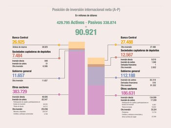 Por otro lado, existen un pasivo de USD 49.072 millones en inversión de cartera, pero como los activos en ese punto alcanzan los USD 83.598 millones, en ese caso el saldo es de USD 34.525 millones a favor.