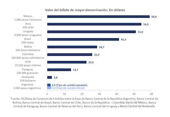 Un análisis comparativo realizado por los economistas Fabio Ventre y Martina González, del Instituto de Investigaciones Económicas de la Bolsa de Comercio de Córdoba, da cuenta de una amplia diferencia entre Argentina y el resto de los países de la región. El estudio señala que para equipararnos a los billetes de mayor valor en dólares, como son los 1.000 pesos mexicanos, los 200 soles peruanos o los 2.000 pesos uruguayos, Argentina necesitaría un billete de 50 mil pesos.
