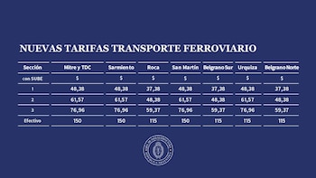 En lo que respecta a los trenes, el Gobierno nacional incrementará un 45% el valor de los boletos de tren del AMBA a partir del 15 de enero. Con esto, la tarifa mínima de Mitre, Sarmiento y San Martín saltó de $33,29 a $48,38 y la de Roca, Belgrano y Urquiza aumentó de $25,72 a $37,38. En tanto, los valores más altos ascendieron a $76,96 y $59,37 respectivamente.