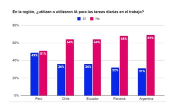Por eso, por ahora, son pocas las empresas argentinas que se sumaron a la tendencia mundial de incorporar cada vez más programas de IA al trabajo diario. De hecho, la Argentina es el país de la región en donde menos se utiliza Inteligencia Artificial en el contexto laboral: solamente el 31% de las personas manifestó utilizarla. En el resto de los países la tendencia es mayor: en Perú el 49% hizo uso de IA para las tareas diarias dentro de sus organizaciones; en Chile y Ecuador, el 36%; y en Panamá, el 32%.