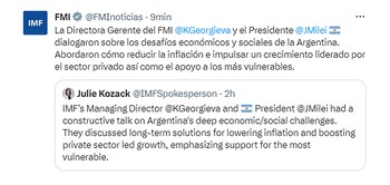 Por su parte, la portavoz del organismo Julie Kozack aseguró que Milei y Georgieva “tuvieron una charla constructiva sobre los profundos desafíos económicos y sociales de Argentina. Discutieron soluciones a largo plazo para reducir la inflación e impulsar el crecimiento liderado por el sector privado, enfatizando el apoyo a los más vulnerables”.