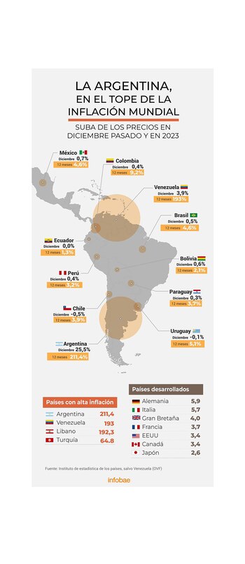 Así, la proyección de Latinfocus para la Argentina en 2024 es del 224%, seguida por Venezuela con 168%, Colombia 6%, Uruguay 5,8%, México 4,3%, Bolivia 4%, Brasil 3,9%, Paraguay 3,6%, Perú 3,2% y Ecuador 2,5%.