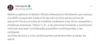 “Mañana saldrá en el Boletín Oficial la Resolución Ministerial que instruye a la AFIP a suspender hasta el 31 de Julio el inicio de los juicios de ejecución fiscal y la traba de medidas cautelares a las micro, pequeñas y medianas empresas -Tramo 1 y 2-, a las personas humanas y sucesiones indivisas que sean consideradas pequeños contribuyentes, a las entidades sin fines de lucro y a los contribuyentes pertenecientes al sector de salud”, publicó el funcionario.
