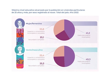 Según el Censo 2022 del Indec, sólo 24,4% de la población masculina mayor de 25 años tiene estudios terciarios o universitarios completos o incompletos. Otro 25,3% llegó a terminar el secundario y un 49,3% no llegó a terminar el secundario.