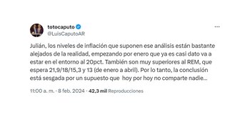 El jefe del Palacio de Hacienda salió al cruce de ese posteo en la red social X con su propia opinión sobre si existe, o no, una situación de atraso cambiario definitiva. “Los niveles de inflación que suponen ese análisis están bastante alejados de la realidad, empezando por enero que ya es casi dato va a estar en el entorno al 20 por ciento. También son muy superiores al REM, que espera 21,9 / 18 / 15,3 y 13 (de enero a abril). Por lo tanto, la conclusión está sesgada por un supuesto que hoy por hoy no comparte nadie”, mencionó Caputo.