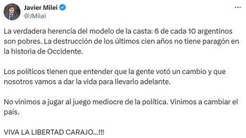 Milei culpó a la herencia del gobierno anterior por el deterioro de los indicadores sociales. “La verdadera herencia del modelo de la casta: 6 de cada 10 argentinos son pobres. La destrucción de los últimos cien años no tiene paragón (sic) en la historia de Occidente. Los políticos tienen que entender que la gente votó un cambio y que nosotros vamos a dar la vida para llevarlo adelante. No vinimos a jugar al juego mediocre de la política. Vinimos a cambiar el país”, dijo el jefe de Estado.