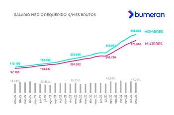 En enero, el salario requerido promedio por hombres fue de $555.636 brutos por mes, mientras que el solicitado por las mujeres fue de $473.966 por mes. De esta manera, la diferencia salarial según género fue de 17,23% a favor de los varones, lo que representó una disminución de 2 puntos porcentuales respecto al mes anterior.