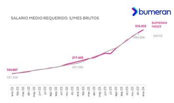El salario promedio pretendido por los argentinos que están buscando un nuevo empleo fue de $510.935 brutos en enero, un valor que significó un incremento de sólo 5,42% respecto al mes anterior y un aumento 15,18 puntos porcentuales por debajo de la inflación del periodo, que fue de 20,6%. Dicho de otra forma, el sueldo requerido cayó en términos reales.