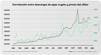 Claramente, la comparación entre las descargas de apps cripto locales y el precio del dólar, confirma como el uso de de las criptomonedas fue incorporado como un mecanismo de protección contra la devaluación y de esquivar las restricciones cambiarias.