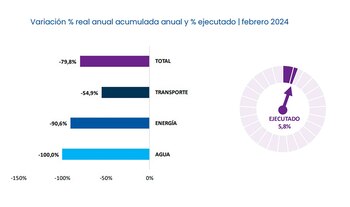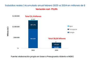 Los principales subsidios económicos a los sectores de agua, energía y transporte tuvieron en febrero una reducción nominal acumulada del 25,3% a.a. respecto de igual periodo del año anterior y por lo tanto una reducción real del 79,8% a.a. en el período. Hasta los primeros veinte días de febrero se acumula una ejecución del 5,8% respecto del crédito vigente para los rubros seleccionados, dice el último reporte del Observatorio de Tarifas y Subsidios del Instituto Interdisciplinario de Economía Política de la UBA y el Conicet.