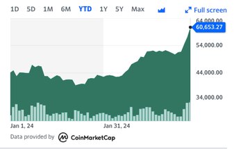Pasadas las 11 de la mañana, el Bitcoin opera con una ganancia de 6,6% a USD 60.600, mientras que en lo que va de 2024 las ganancias de esta moneda virtual superan el umbral del 40%, que la vuelven una de las jugadas financieras más ganadoras de este inicio de año.