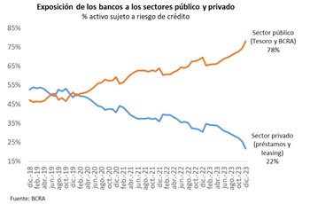 “En consecuencia, a fin de diciembre de 2023 del total de la cartera de activos sujetos a riesgo de crédito, el 78% estaba expuesto al sector público (55% BCRA y 45% Tesoro Nacional) y el 22% al sector privado (préstamos y leasing)», una proporción completamente diferente a la de los inicios de la gestión del ex presidente, cuando «la relación era prácticamente 50-50%”.