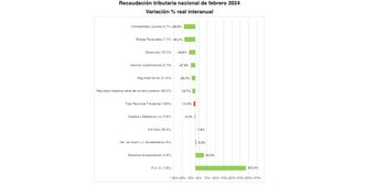 Un informe del Iaraf (Instituto Argentino de Análisis Fiscal) precisó que en febrero “la recaudación tributaria nacional habría disminuido un 11% real respecto a febrero de 2023. Al excluir la recaudación por tributos vinculados al comercio exterior, la caída sería del 19%. Es importante recordar que en febrero la colocación del bono Bopreal generó una recaudación extra en el impuesto PAIS”.
