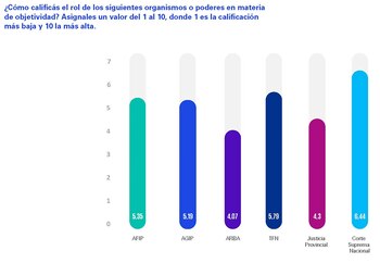 También en línea con esas observaciones, cuando se les pidió calificar el rol y la objetividad de las diferentes agencias estatales directa o indirecta y potencialmente involucradas en el proceso fiscal o eventualmente llamadas a decidir sobre la materia, como la AFIP, el Tribunal Fiscal de la Nación, las Justicias provinciales, la Corte Suprema de Justicia de la Nación, la AGIP (la agencia recaudadora de la Ciudad de Buenos Aires) y Arba (su equivalente bonaerense), Arba, la Agencia de Recaudación de la provincia de Buenos Aires, fue la peor calificada, con un puntaje de 4,07 en una escala del 1 al 10 (diez).