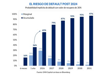 El análisis de GMA Capital subraya la volatilidad implícita en los mercados. La consultora observa que “el margen para mejorar también es visible a través de la probabilidad implícita de default en los Credit Default Swaps (CDS)”, evidenciando la precaución de los inversores ante los riesgos de un evento de crédito lejos de ser insignificante. Resaltan además que para los años venideros, las probabilidades de default reflejadas en los CDS muestran un mercado que aún desconfía de la estabilidad fiscal y financiera argentina.