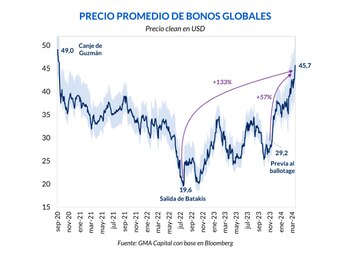 Un informe de GMA Capital, dirigido por el economista Nery Persichini, destaca la escalada impresionante de estos instrumentos financieros: “El recorrido de los Globales no deja espacio para el escepticismo. Desde el 8 de diciembre, la base para comparar el cambio de gobierno, el valor medio ponderado de los bonos mejoró un 32%”. Esta tendencia ascendente no se detuvo ahí, ya que “al contemplar el hito del balotaje, el retorno creció hasta 57%”. Es más, desde julio de 2022, la firma observó que “la recuperación de los precios alcanzó 133%”, un dato que resalta la confianza renovada de los inversores en la deuda argentina.